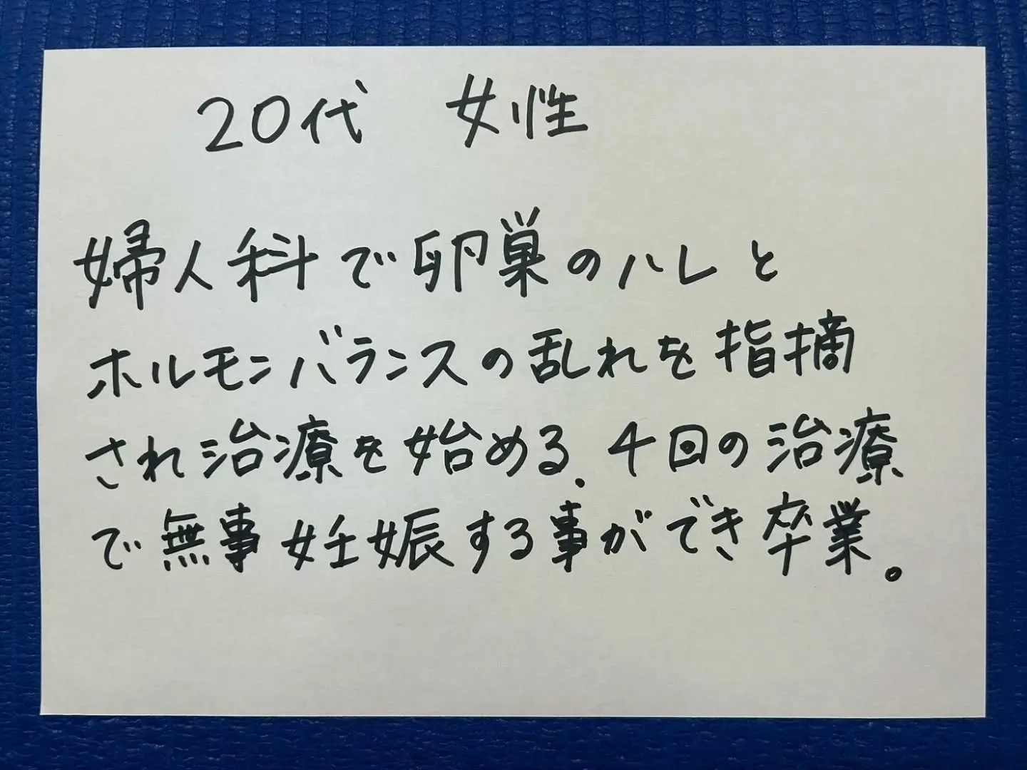 二十代の女性が卵巣の腫れとホルモンバランスの乱れの治療を始めたところ、4回目の治療で妊娠するところまで回復されました!