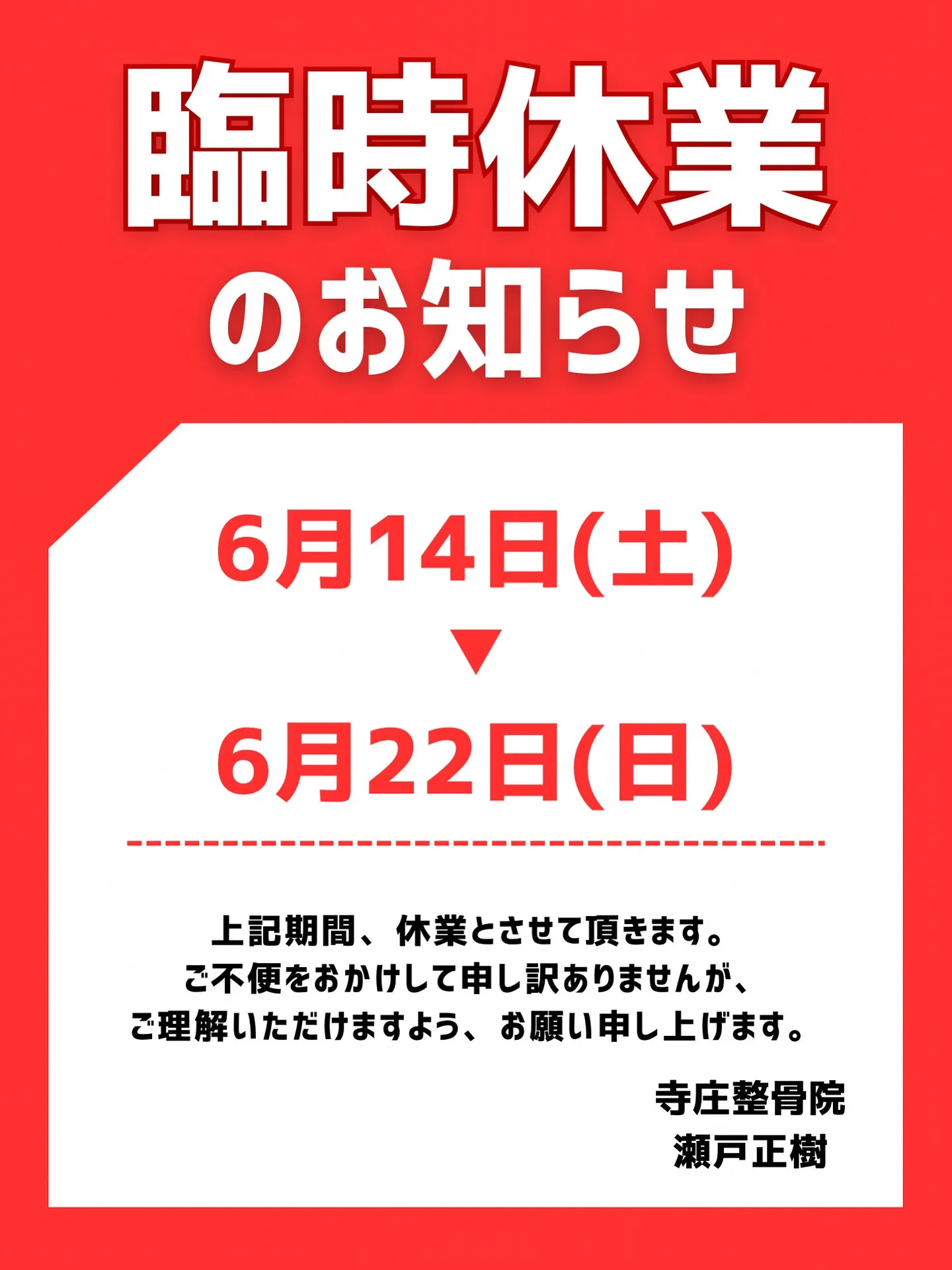 〖 皆様へお知らせです 〗 〖皆様へお知らせです〗いつも寺庄整骨院をご利用頂きありがとうございます🪽急で申し訳ございませんが本日6月14日(土)から22日(日)の間、臨時休業致します。また6月23日の【午後診】16時~17時半のご予約…
