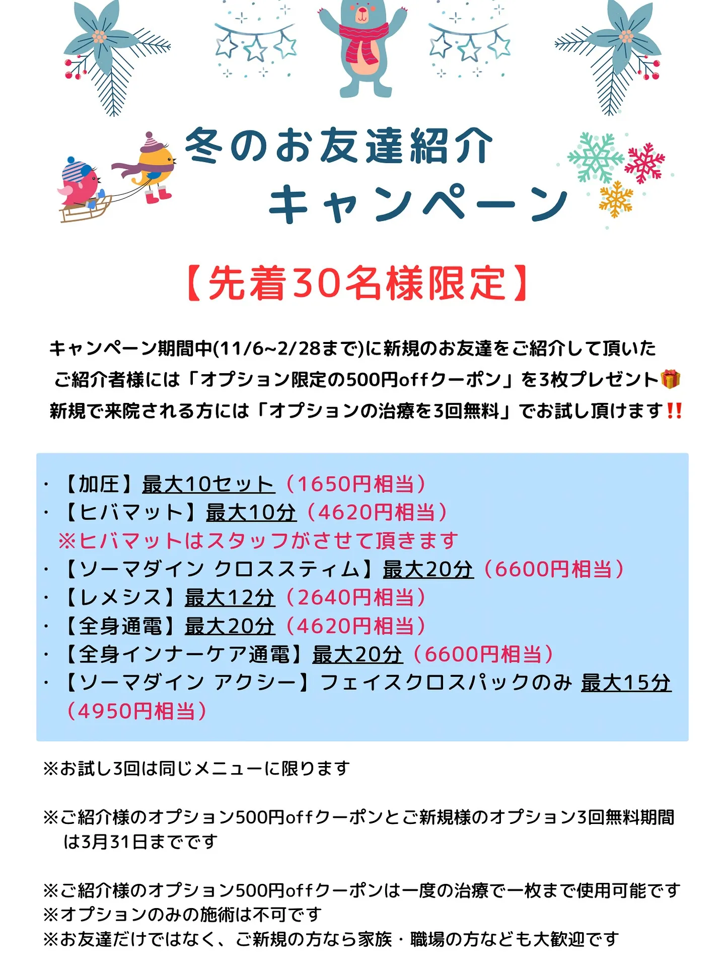 滋賀県・甲賀市の整骨院なら寺庄整骨院へ🚴🏻‍♂️先着30名様限定で〖冬のお友達紹介キャンペーン〗をはじめます⛄️❄️先着順なので無くなり次第、終了させて頂く事になります🥲のでお早めに🚀2月末(2月28日)…
